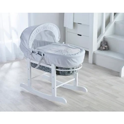Kinder Valley White Teddy Wash Day Grey Wicker Moses Basket with Rocking Stand, Adjustable Hood, Fibre Mattress & Padded Liner