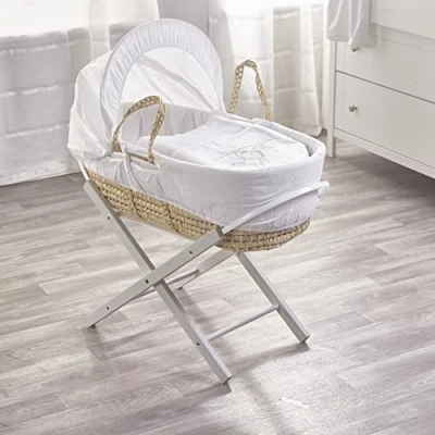 Kinder Valley White Teddy Wash Day Palm Moses Basket with Folding Stand Grey, Adjustable Hood, Fibre Mattress & Padded Liner