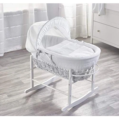 Kinder Valley White Waffle Bows Wicker Moses basket with Rocking Stand, Adjustable Hood, Fibre Mattress & Padded Liner