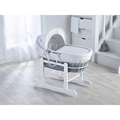 Kinder Valley White Waffle Grey Wicker Moses Basket with Rocking Stand, Adjustable Hood. Fibre Mattress & Padded Liner