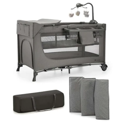 Kinderkraft Joy 2 Acc in 1 Travel Cot for Baby up to 25 kg, Quick and Easy Folding, Includes Crib Carousel with Toys, Diaper Racks Changing Mat, Carry Bag, Grey
