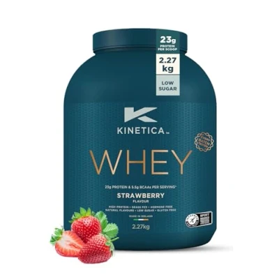 Kinetica Strawberry Whey Protein Powder 2.27kg 23g per Serving 75 Servings Sourced from EU Grass Fed Cows Superior Mixability & Taste