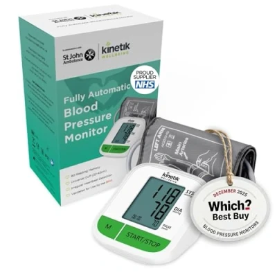 Empowering Health at Home: Professional and reliable Kinetik blood pressure monitor, with Irregular heartbeat detection and a 90 reading memory, so you can keep a record to share with your GP. Quickly and accurately measure and record your blood pressure Quick & Easy to Read Results: One button operation blood pressure machine with innovative inflate technology which takes a reading whilst the cuff inflates, 90 reading memory & quick release design for fast readings; minimising pressure on your arm Adjustable Universal Large Cuff: Our home blood pressure monitor fits upper arms from 22-42cm; this broad range means our bp monitor will fit the majority of arms comfortably, for blood pressure support and confidence from the comfort of your home Trusted Brand: Blood-pressure monitor used by the NHS & in association with St John Ambulance. Clinically validated, BIHS & ESH approved for safe and reliable results; quick reference indicator highlights against the indicator to simply classify readings Easy Operation: Press start and relax as the cuff automatically inflates. For accurate results, we advise taking your blood pressure at the same time every day. Avoid eating, drinking and exercise for an hour prior to using the blood-pressure machine Kinetik Wellbeing: As the UK’s largest independent medical device company, we are committed to producing clinically validated devices to improve health and wellbeing with innovative, easy-to-use products designed to the highest medical standards PLEASE NOTE: This device is not suitable for patients fitted with pacemakers or other implanted cardiac devices Which? Buy: Confirmed as a top performer in tests by Which? for blood pressure monitors, December 2025
