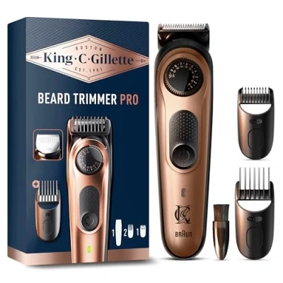 King C Gillette Cordless Beard Trimmer PRO for Men with 40 Length Settings. 1 Trimmer, Detail Cleaning Brush, 4 Interchangeable Combs, Charger, and Zip Pouch