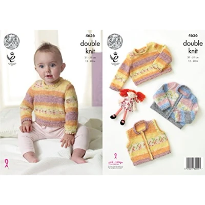 This double knitting pattern leaflet 4656 by King Cole will instruct you on how to create a waistcoat, cardigan and sweater with picot edging. The pattern gives you instructions to create the garments suitable for babies with a chest size of 31cm - 51cm (12" - 20") approximately. This King Cole knitting pattern is suitable for use with most double knit yarns, however tensions may vary and we recommend you knit a tension square before knitting the whole garment. See image provided for the number of 100g balls of yarn required for each garment and the colours that are illustrated in the leaflet. The yarn illustrated is Splash DK and this is available to purchase on a separate listing. Please note that this is a knitting pattern and NOT a set of finished knitted garments. All knitting instructions are written in English.
