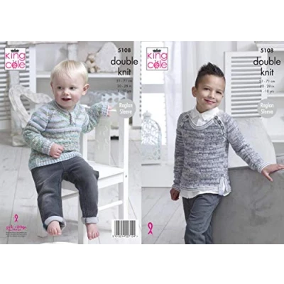 P5108 Double Knitting Knitting Pattern To make the items featured in this leaflet you will need 3.75mm and 4.0mm knitting needles. The following designs are featured in this leaflet: Sweaters. Size Information: To Fit Ages: 1 - 10 Years Chest: 51 - 72 cms / 20 - 28 Inches Please see leaflet for exact yarn requirements. King Cole recommend that you use King Cole Comfort and Comfort Kids DK other yarns maybe used but check tension requirements prior to starting your project. All instructions are in English.