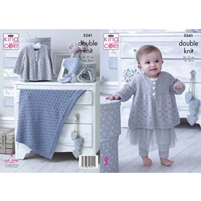King Cole 5341 Pattern To make the items featured in this leaflet you will need 3.25mm and 4.0mm knitting needles. The following designs are featured in this leaflet: Matinee Jacket, Hat, Bootees and Blanket . Size Information: To Fit Chest: 36 - 51cms / 14 - 20 inches Please see leaflet for exact yarn requirements. King Cole recommend that you use King Cole Finesse Cotton Silk DK other yarns maybe used but check tension requirements prior to starting your project. All instructions are in English.
