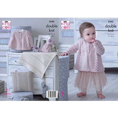 This is a paper KNITTING PATTERN instruction leaflet and not the finished items. Knit with King Cole Finesse Cotton Silk DK To make the items featured in this leaflet you will need 3.25mm and 4.0mm knitting needles. The following designs are featured in this leaflet: Matinee Jacket, Hat, Cushion and Blanket . Size Information: To Fit Chest: 36 - 51cms / 14 - 20 inches Please see leaflet for exact yarn requirements. King Cole recommend that you use King Cole Finesse Cotton Silk DK other yarns maybe used but check tension requirements prior to starting your project. All instructions are in English.