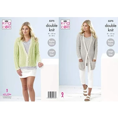 King Cole 5375 Pattern This is a paper KNITTING PATTERN instruction leaflet and not the finished items. Knit with King Cole Cotton Top DK To make the items featured in this leaflet you will need 3.25mm and 4.0mm knitting needles. The following designs are featured in this leaflet: Raglan Short and Long Length Cardigans. Size Information: To Fit Bust: 81 - 127 cm / 32 - 50 inches The yarn requirements for the garments in this leaflet are as follows: Short Cardigan to fit bust 32" - 34" [36" - 38": 40" - 42": 44" - 46": 48" - 50"] use King Cole Cotton Top DK 100g - Avocado (4222) 5 [5: 6: 6: 7: King Cole Cotton Top DK 100g - White (4215): 1: 1: 1: 1: 1] balls. Long Cardigan to fit bust 32" - 34" [36" - 38": 40" - 42": 44" - 46": 48" - 50"] use King Cole Cotton Top DK 100g - Grey (4219) 6 [6: 7: 8: 8: King Cole Cotton Top DK 100g - White (4215): 1: 1: 1: 1: 1] balls.