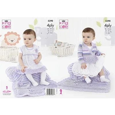 King Cole 5390 Knitting Pattern Baby Cardigan Pinafore and Blanket in Big Value 4 Ply, 14" 21" Chest