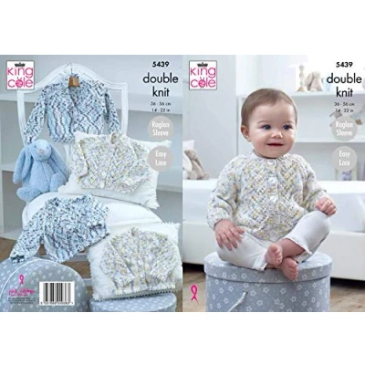 King Cole 5439 Pattern This is a paper KNITTING PATTERN instruction leaflet and not the finished items. Knit with King Cole Cherish Dash DK To make the items featured in this leaflet you will need 3.25mm and 4.0mm knitting needles. The following designs are featured in this leaflet: Easy Lace, Raglan Sleeve, Round Neck and V Neck Cardigans. Size Information: To Fit Chest: 36 - 56 cms / 14 - 22 inches The yarn requirements for the garments in this leaflet are as follows: Round Neck Cardigan to fit chest 14" [16": 18": 20": 22"] use King Cole Cherish Dash DK 100g - Moonlight (2720) OR Lemonade (2719) 1 [1: 2: 2: 2] balls. V Neck Cardigan to fit chest 14" [16": 18": 20": 22"] use King Cole Cherish Dash DK 100g - Moonlight (2720) OR Lemonade (2719) 1 [1: 2: 2: 2] balls.