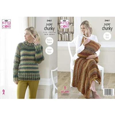 King Cole 5461 Pattern To make the items featured in this leaflet you will need 8.0mm and 10.0mm knitting needles. The following designs are featured in this leaflet: Raglan Sleeve Sweater, Cushion and Throw. Size Information: To Fit Bust: 71cm - 117cm / 28 - 46 inches The yarn requirements for the garments in this leaflet are as follows: Sweater to fit bust 28" / 30" [32" / 34": 36" / 38": 40" / 42": 44" / 46"] use King Cole Explorer Super Chunky 100g - Cook (4301) 7 [8: 8: 9: 9] balls. Throw / Lap Blanket measurments 91cm x 91cm / 36" x36" use King Cole Explorer Super Chunky 100g - Raleigh (4298) 12 balls. Cushion measurements 35cm x 35cm / 13.75" x 13.75" [41cm x 41cm / 16" x 16"] use King Cole Explorer Super Chunky 100g - Raleigh (4298) 3 [3] balls. All instructions are in English.