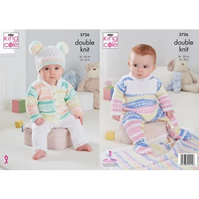 King Cole 5726 Knitting Pattern Baby Cardigan Trousers Hat Onsie Blanket in Cherish and Cherished DK, Multi, 14'' 22''