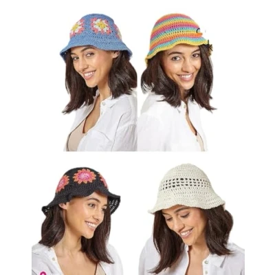 This is a King Cole crochet pattern that instructs you on how to crochet ladies bucket hats with various patterns, using Cottonsoft DK yarn. King Cole Cottonsoft DK in various shades stated in the leaflet Various 1 x 4mm Crochet Hook Please note: THIS IS A CROCHET PATTERN INSTRUCTING YOU HOW TO CREATE THE ITEM(S) YOURSELF AND NOT A READY MADE PRODUCT.