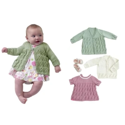 This is a paper KNITTING PATTERN instruction leaflet and not the finished items. Knit with King Cole Cottonsoft DK This is a paper KNITTING PATTERN instruction leaflet and not the finished items. Knit with King Cole Cottonsoft DK To make the items featured in this leaflet you will need 3.75mm and 4mm knitting needles. The following designs are featured in this leaflet: Matinee Coat, Angel Top and Cardigan. Size Information: To Fit Ages: Premature to 12 months The yarn requirements for the garments in this leaflet are as follows: Matinee Coat to fit chest 12" [14": 16": 18": 20"] use King Cole Cottonsoft DK 100g - 1576 Sage 1 [1: 2: 2: 3] balls. Angel Top to fit chest 12" [14": 16": 18": 20"] use King Cole Cottonsoft DK 100g - Rose Petal (1577) 1 [1: 1: 2: 2] balls. Cardigan to fit chest 12" [14": 16": 18": 20"] use King Cole Cottonsoft DK 100g - Ecru (711) 1 [1: 1: 2: 2] balls. All instructions are in English.