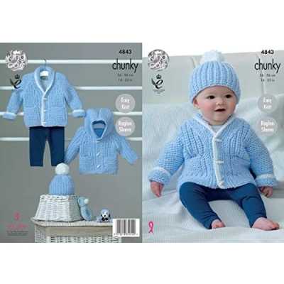 King Cole 4843 Pattern To make the items featured in this leaflet you will need 5.0mm and 5.5mm knitting needles. The following designs are featured in this leaflet: Jackets and Hat. Size Information: To Fit Chest: 36 - 56 cm / 14 - 22 inches Please see leaflet for exact yarn requirements. King Cole recommend that you use King Cole Big Value Baby Soft Chunky other yarns maybe used but check tension requirements prior to starting your project. All instructions are in English.