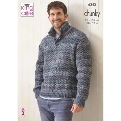 This is a King Cole knitting pattern that instructs you on how to create a mans sweater with or without collar, using Cottagespun Chunky yarn. King Cole Cottagespun Chunky in Summer Sunset (6007) & Frosty Dawn (6009) 38” – 52” (97cm – 132cm) 1 pair of 5.5mm & 6mm Please note: THIS IS A KNITTING PATTERN INSTRUCTING YOU HOW TO CREATE THE ITEM(S) YOURSELF AND NOT A READY MADE PRODUCT.