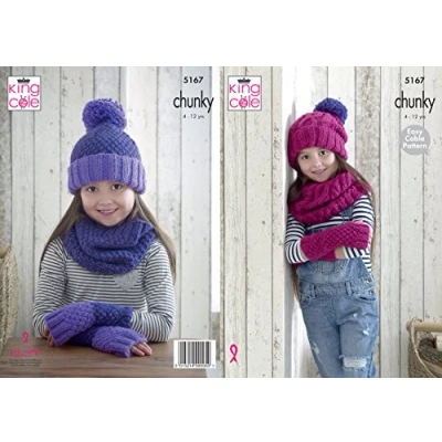King Cole Kids Chunky Knitting Pattern Girls Easy Cable Mittens Snoods & Hats (5167)