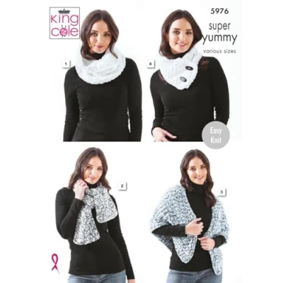 King Cole Ladies Super Yummy Knitting Pattern Easy Knit Cowl & Scarves (5976)