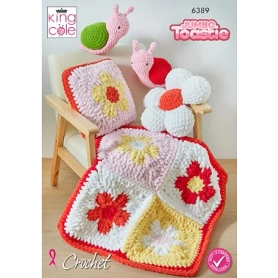 This is a King Cole Crochet pattern that instructs you on how to create Flower Cushions, a Blanket & Snail Toy, using King Cole Jumbo Toastie yarns. King Cole Jumbo Toastie yarn in – various shades of your choice. Various – See paragraph . 1 x 8mm & 12mm Crochet Hook. Please note: THIS IS A CROCHET PATTERN INSTRUCTING YOU HOW TO CREATE THE ITEM(S) YOURSELF AND NOT A READY MADE PRODUCT.