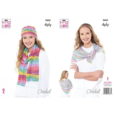 This is a paper CROCHET PATTERN instruction leaflet and not the finished items. Crochet with King Cole Summer 4 Ply To make the items featured in this leaflet you will need 3.0 mm and 4.0 mm crochet hooks. The following designs are featured in this leaflet: Scarf, Hat and Triangular Wrap. Size Information: One Size The yarn requirements for the garments in this leaflet are as follows: Scarf measurements 21 cm x 182 cm / 8.25" x 72" use King Cole Summer 4 Ply 100g - Can-Can (4566) 2 balls. Hat to fit Average Sized Woman's Head use King Cole Summer 4 Ply 100g - Can-Can (4566) 1 balls. Triangular Wrap measurements 101 cm x 60 cm / 39.75" x 23.75" use King Cole Summer 4 Ply 100g - Fruit Punch (4565) 2 balls. All instructions are in English.