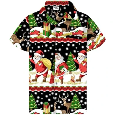 King Kameha Men Christmas Santa Claus Office Party Short Sleeve Button Down Shirts, Border Print, Black, M