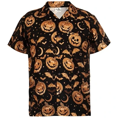 King Kameha Men's Halloween-Shirt Digital-Printed Pumpkins Skeleton Short-Sleeve Button-Down, Pumpkin-Bat, Sepia, XL