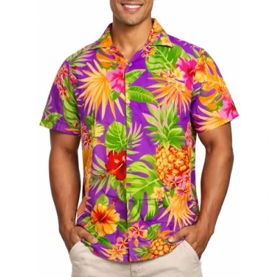 King Kameha Men's Pineapple Designs Summer Party Shirts Short Sleeve, Pineapple, Purple, XL