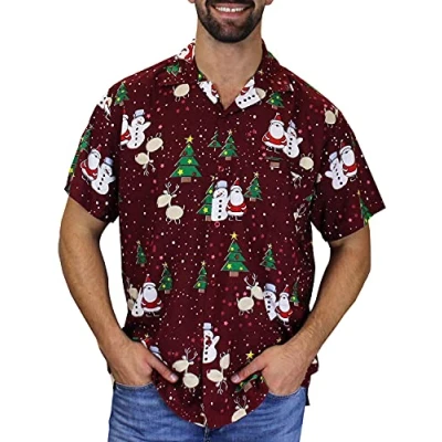 King Kameha Men's Ugly Christmas Shirt Funky Short Sleeve Button Up Print Casual, Buddies, Red, M