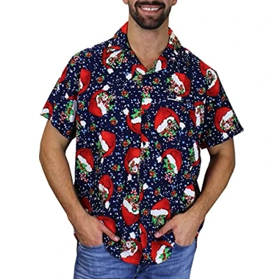 King Kameha Men's Ugly Christmas Shirt Funky Short Sleeve Button Up Print Casual, Flying Hats, Blue, 3XL