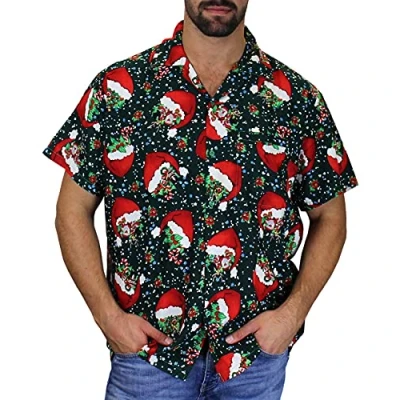 King Kameha Men's Ugly Christmas Shirt Funky Short Sleeve Button Up Print Casual, Flying Hats, Green, XS