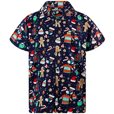 King Kameha Men's Ugly Christmas Shirt Funky Short Sleeve Button Up Print Casual, Ginger Bread, Blue, M