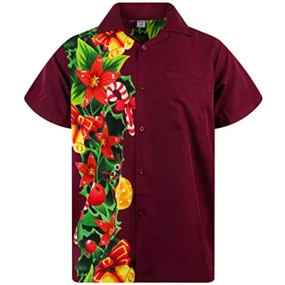 King Kameha Men's Ugly Christmas Shirt Funky Short Sleeve Button Up Print Casual, Wedding, Red, XL