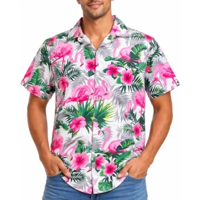 King Kameha Mens Funky Flamingos Short Sleeve Hawaiian Shirt Novelty Summer Vibes, Flamingo Flowers, White Pink, XS