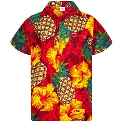 King Kameha Men's Pineapple Desings Summer Party Shirts Short Sleeve, Hibiscus, Red, M