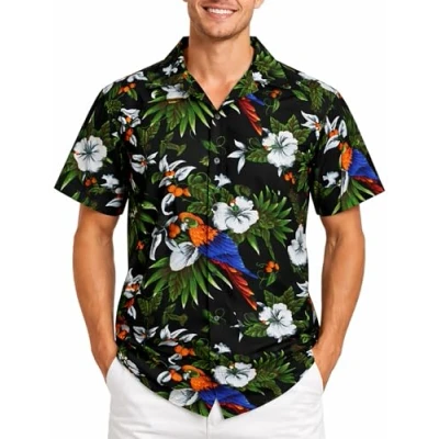 King Kameha Mens Vintage Hawaiian Shirt Casual Short Sleeve Button Down Bird Designs, Cherry Parrot, Black, XL