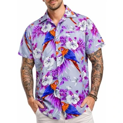 King Kameha Mens Vintage Hawaiian Shirt Casual Short Sleeve Button Down Bird Designs, Cherry Parrot, Grey, XL