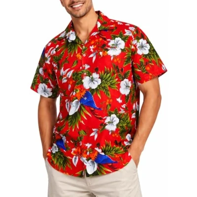 King Kameha Mens Vintage Hawaiian Shirt Casual Short Sleeve Button Down Bird Designs, Cherry Parrot, Red, XXL