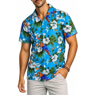 King Kameha Mens Vintage Hawaiian Shirt Casual Short Sleeve Button Down Bird Designs, Cherry Parrot, Yellow, L