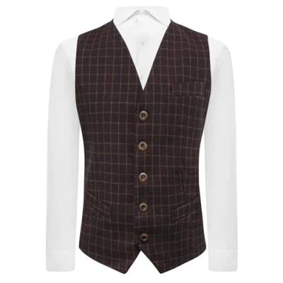 Stylish Merlot Red waistcoat in a premium wool blend fabric with two-tone Tattersall check Stylish Merlot Red waistcoat in a premium wool blend fabric with two-tone Tattersall check 5 wooden button front with 3 usable pockets Adjustable back ensures comfortable fit and suitable for chest sizes up to 2 inches smaller This waistcoat is a slim tailored fit, so if your tummy sticks out beyond your chest then use your tummy size rather than your chest! Typically this means going one size larger than usual. M=37-40" chest, L=40-42" chest, XL=42-44" chest, XXL=44-46"chest, 3XL=46-48" chest Matching tie, bow tie and pocket square also available as part of the King & Priory Heritage Collection