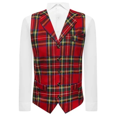 This waistcoat is a slim tailored fit, so if your tummy sticks out beyond your chest then use your tummy size rather than your chest! Typically this means going one size larger than usual. M=37-40" chest, L=40-42" chest, XL=42-44" chest, XXL=44-46"chest, 3XL=46-48" chest Traditional red tartan waistcoat with lapel in a premium fabric Traditional red tartan waistcoat with lapel in a premium fabric 5 button front with 3 usable pockets Adjustable back ensures comfortable fit and suitable for chest sizes up to 2 inches smaller Matching waistcoat without a lapel, tie, bow tie and pocket square also available as part of the King & Priory Tartan Collection