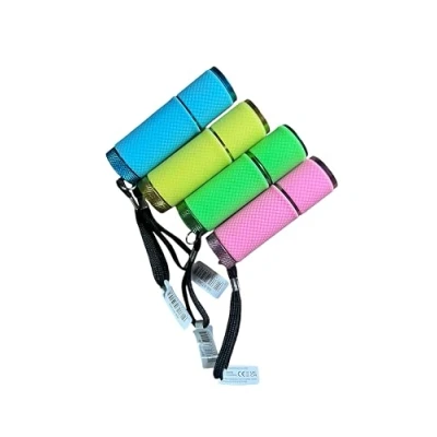 SPECIFICATIONAvailable in 4 bright colours which will glow in the dark, these torches are manufactured with a ruggedshockproof aluminium housing & come with 9 super bright LED bulbs, rubber push button on/off switch &integral wrist strap. They require 3 x AAA batteries which are not supplied.CE ApprovedBARCODE 5017403 059295CARTON QTY 64/16 Pcs APPROX ITEM WEIGHT 38gPACKAGING Barcode Label in Colour Display Box