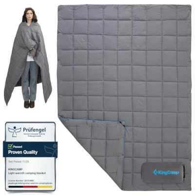 Amazon LIGHTWEIGHT & PORTABLE WARMTH ON-THE-GO:This camping blanket packable measures ​68.9" x 53.1"and weighs only 1.32 lbs—lighter than a water bottle. It offers full-body coverage without feeling bulky and packs down neatly into the 13.8"x9.5" stuff sack included, perfect for hiking, travel, backpacking, or weekend road trips.Whether you're looking for a blanket for camping or a packable blanket travel essential, this is built for the trail. COZY WARM LOFT FILL WITH DURABLE 20D NYLON SHELL FOR ALL-WEATHER WARMTH:This travel down-alternative camping blanket features 150G/㎡ of hypoallergenic Warm Loft fiberfill, offering the cozy feel of down without allergens or animal products. Its tightly woven 20D nylon shell is water-resistant and windproof, helping lock in warmth and block out cold air—ideal for campgrounds, the beach, or even mountain cabin stays. WEARABLE, HANDS-FREE DESIGN:Snap buttons let this puffy camping blanket convert effortlessly into a shawl or cape, letting you stay warm while keeping your hands free—perfect for fireside lounging, outdoor events, or campsite strolls.This convertible style makes it more than just a regular puffy blanket—it adapts to your movement and warmth needs on the go. WATER-REPELLENT & DURABLE FOR UNINTERRUPTED OUTDOOR FUN:Built with durable 20D ripstop nylon, this camp blanket has a water-repellent finish and triple-stitched seams to handle wind and light rain with ease. Whether you're cheering from stadium seats or relaxing at a rainy campsite, it keeps you warm and dry without the stiffness of a rain jacket. MULTI-USE FOR ANY OCCASION — OUTDOOR, INDOOR COMFORT WITH PRACTICAL DETAILS:More than just a camping blanket, it works as a picnic mat, shawl, travel pillow, or emergency sleeping bag. Whether you're camping, watching outdoor movies, or relaxing at home, it’s your go-to gear for year-round comfort. The smooth, tightly woven fabric resists pet hair and is machine washable—easy to maintain, even in homes with pets. Lightweight and packable, it's a versatile choice for everyday use and travel.