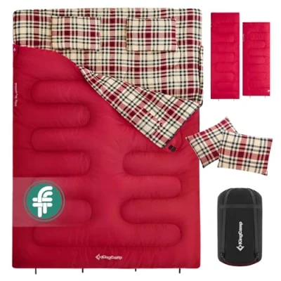 KingCamp Double Sleeping Bag with Pillow 4 Season, Bags for Adult Kids Cotton Flannel Winter Lightweight Extra Large 2 Person Camping Backpacking Hiking Indoor Outdoor