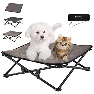 SMALL SIZE -- This small dog bed measures 57 × 57 × 23 cm (L × W × H) / 22.4 × 22.4 × 9.1 inches, making it ideal for small to medium-sized dogs or cats weighing up to 45 kg (99 lbs). The KingCamp elevated dog bed keeps your pets clean and cool by lifting them off wet, muddy ground and away from insects. It also helps relieve joint pressure and pain, providing orthopedic support for pets with arthritis or hip dysplasia NO ASSEMBLY, READY IN SECONDS -- Designed with a quick-open frame, this dog camping bed requires zero setup—just unfold and it’s ready to use! After use, simply fold it into 62 x 15 x 14 cm (24.4 x 5.9 x 5.5 inches) and can be stored in carry bag for easy storage and portability. Note: Unlike other beds where only the cover area is usable, the entire size of our bed provides a fully usable resting space for your dog BREATHABLE & LONG-LASTING COMFORT -- Crafted from premium Textilene mesh, this elevated dog bed is tear-resistant, heat-resistant, and ultra-breathable—tough enough to handle playful scratching while keeping your pet cool. The ventilated design promotes airflow, reduces bacteria growth, and prevents pressure sores. When the dog bed gets dirty, just wipe or rinse, and it dries in minutes MULTI-USE DESIGN WITH SUEDE MAT -- Designed for year-round comfort, this dog bed includes a removable suede cotton mat that’s soft, warm, and easy to clean (hand wash recommended). The suede surface absorbs moisture and sweat, while the Oxford bottom bed keeps out dampness and promotes airflow, keeping your pet comfortable in any weather. Use it together for extra warmth, or separately as a lightweight cooling bed or padded mat—ideal for home, garden, camping, or travel EXTRA STABLE & BUILT TO LAST -- Unlike many raised dog beds with only separate stands, the KingCamp dog bed features a cross-frame design with a load-bearing kit for enhanced stability. Inspired by human camping beds, this outdoor dog bed built with powder-coated steel tubes that distribute weight evenly and resist bending. Non-slip foot covers add extra stability and help protect your floors from scratches. Perfect for indoor and outdoor use, at home or on the go!