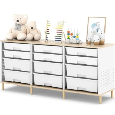 KINGRACK 12 Drawers Storage Cabinet with Wooden Top and Plastic Bins, Toy Organizer Shelf Chest Cubby for Home, Office, Playroom, Classroom & Craft Room (White)