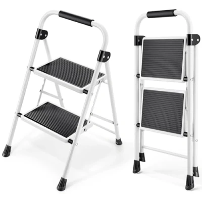 【TRIANGLE SUPPORT】 This 2 step ladder entirely meet the daily needs of household climbing. Equipped with safety hand rail, it makes it open and close smoothly. Horseshoe shape rubber feet make larger contact area to ensure the stability
