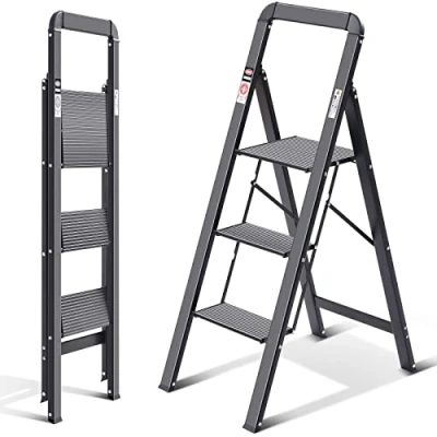 【Ultra-thin Design】 Step ladder is only 4cm thick after folding, making it easy to store in small spaces such as closets and cabinets without taking up too much space, making it very convenient to use. 【Lightweight and Portable】 Ladder Made of lightweight aluminum alloy, this ladder is easy to carry around with its overall light weight. Whether for daily household use or outdoor use, it can be easily carried and used anytime, anywhere. 【Safe and Stable】 The ladder has a non-slip design on the steps and is equipped with handrails and 4 anti-slip feet, which improves the stability and safety of the ladder while also protecting the floor from scratches. It is more reliable to use, without worrying about accidents. 【Sturdy and Durable】Step Ladder Made of high-strength aluminum alloy and crafted with exquisite workmanship, this ladder can support a weight of up to 150kg and is stable and reliable to use. It has passed the European EN14183 certification to ensure product quality, providing you with a reassuring guarantee. 【Practical and Convenient】This ladder is suitable for various occasions such as household, commercial, and industrial use. It is very practical, allowing you to easily complete various household maintenance tasks such as replacing light bulbs, cleaning, and repairing furniture. It is convenient, practical, and saves you time and effort.