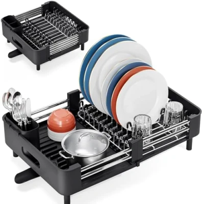 KINGRACK Extendable Dish Draining Rack, Stainless Steel, Foldable Rack with Removable Cutlery Holder and Anti Scratch Holder, Adjustable Drainage Spout, Black