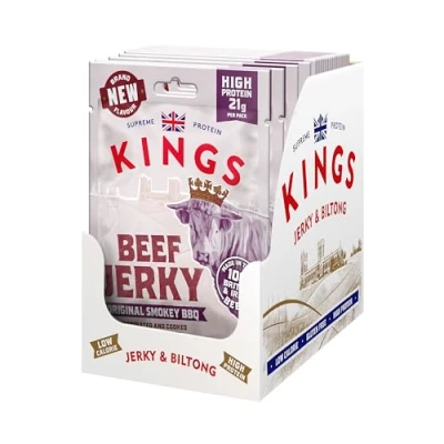 Experience the taste of Kings smokey BBQ flavoured beef jerky. Delicious, lean cuts of dried beef. Savoury snacks perfect for those who crave high protein snacks. Healthy snacks for adults and all ages, offering both nutrition and taste in every tender bite. Packed with beef protein. A great pre or post gym or workout snack choice. Each 60 g pack in this bulk box offers a convenient hand-held option for adventurers on-the-go. Traditional American snacks. Kings beef jerky uses traditional dried, cooked meat techniques similar to biltong from South African food cultures and a sweet BBQ flavouring you’d often see on perfectly grilled steak. Bulk box of 12 x 60 g beef jerky packs. Marinated in a smokey BBQ seasoning and slow dried to create the most tender pieces of mouth-watering cuts of premium British and Irish beef.